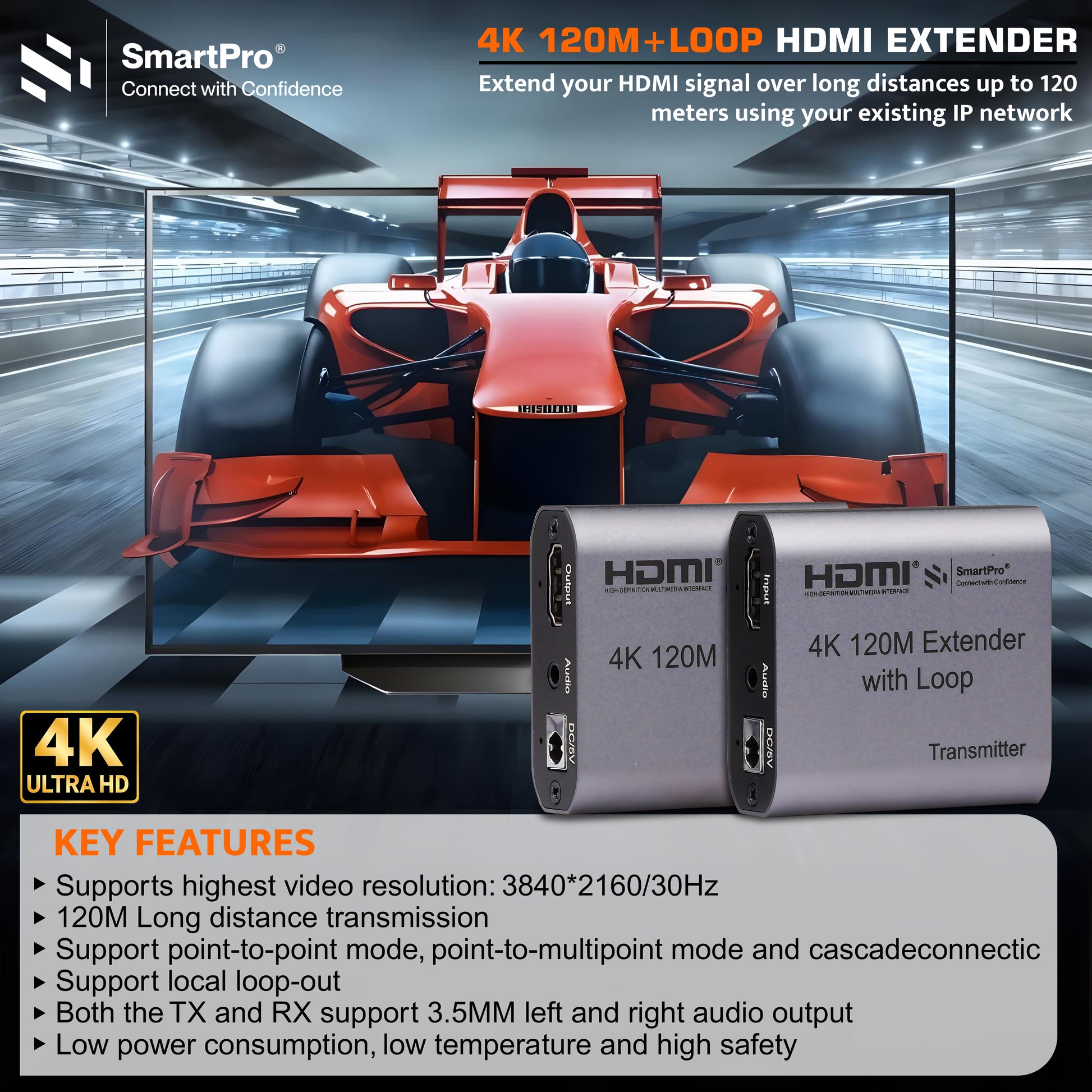 Experience superior long-distance HDMI transmission with the SmartPro 4K 120M HDMI Extender with Loop — designed for high-performance AV setups that demand crystal-clear 4K video quality and reliable signal stability.