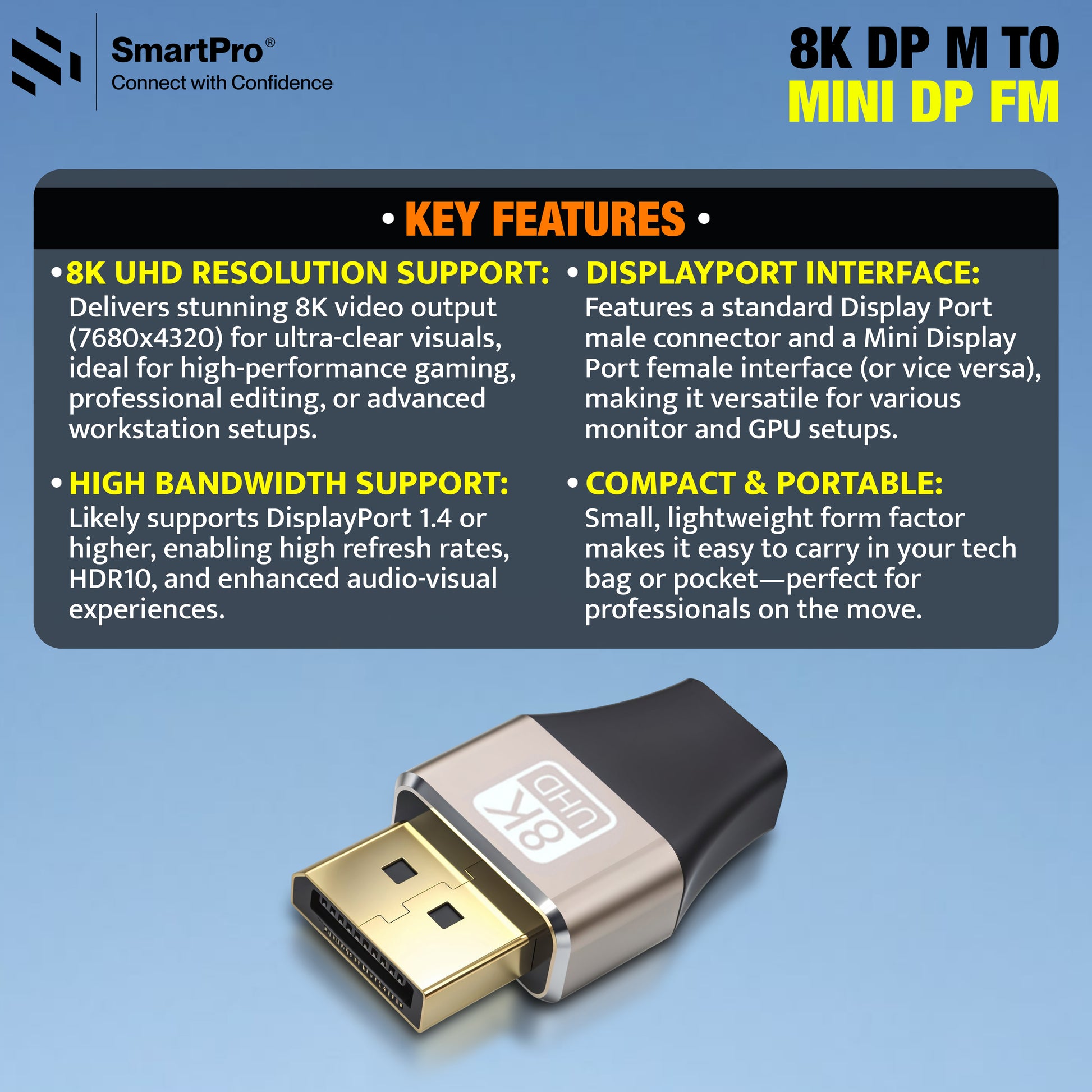 Upgrade your display connectivity with the SmartPro 8K DP Male to Mini DP Female Jointer, designed for exceptional performance, durability, and reliability. Built with a robust metal body, this compact adapter ensures secure connections and superior signal transmission for high-resolution displays and professional setups.