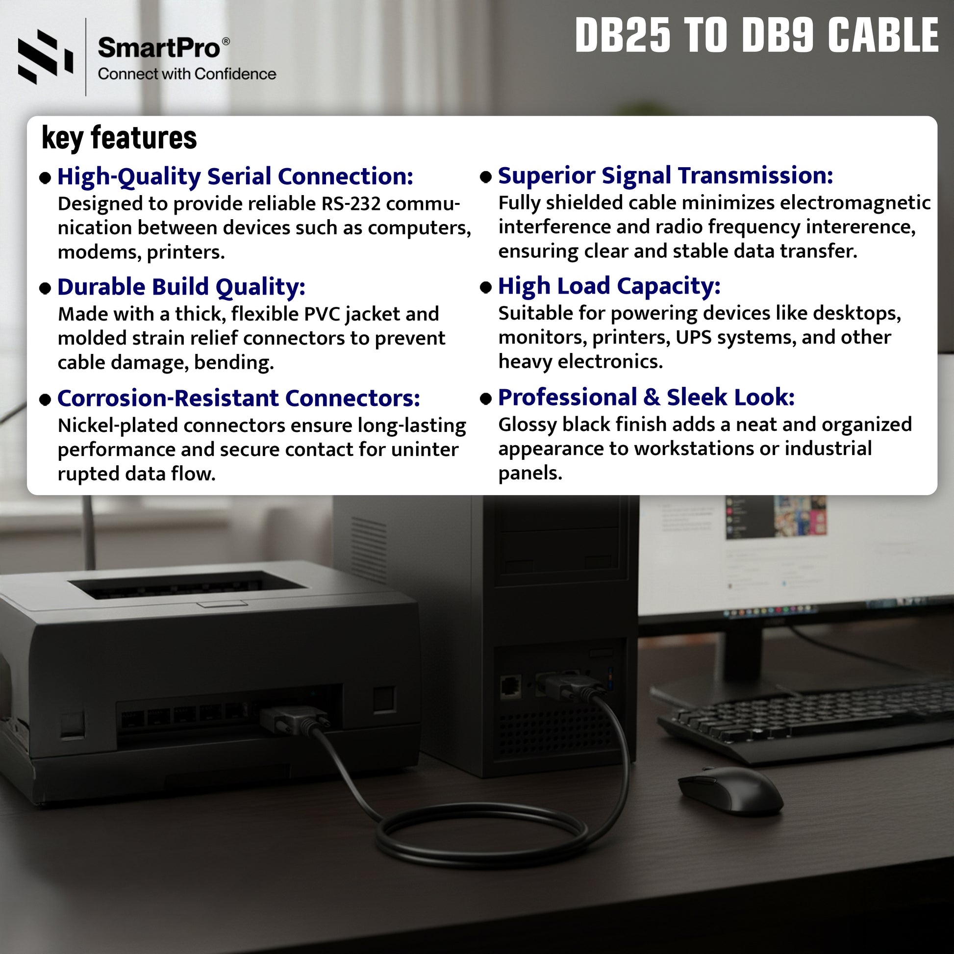 Upgrade your connectivity setup with the SmartPro 9 Pin Female to 25 Pin Male Cable, designed for reliable, high-performance data communication. This 1.5-meter cable is perfect for connecting devices that require DB9 to DB25 serial interfaces, ensuring seamless transmission without signal loss.