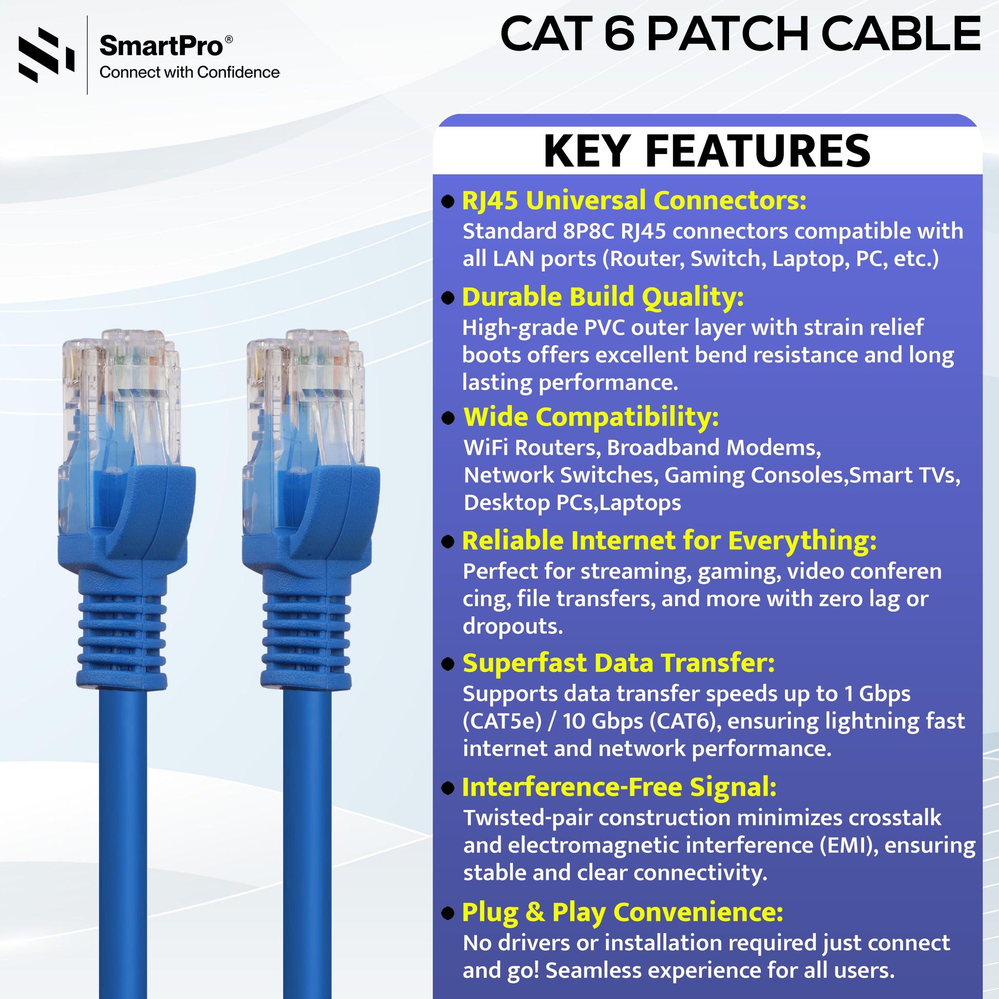 - Whether you're setting up a new network or upgrading an existing one, the SmartPro CAT 6 Cable delivers exceptional speed, stability, and value.