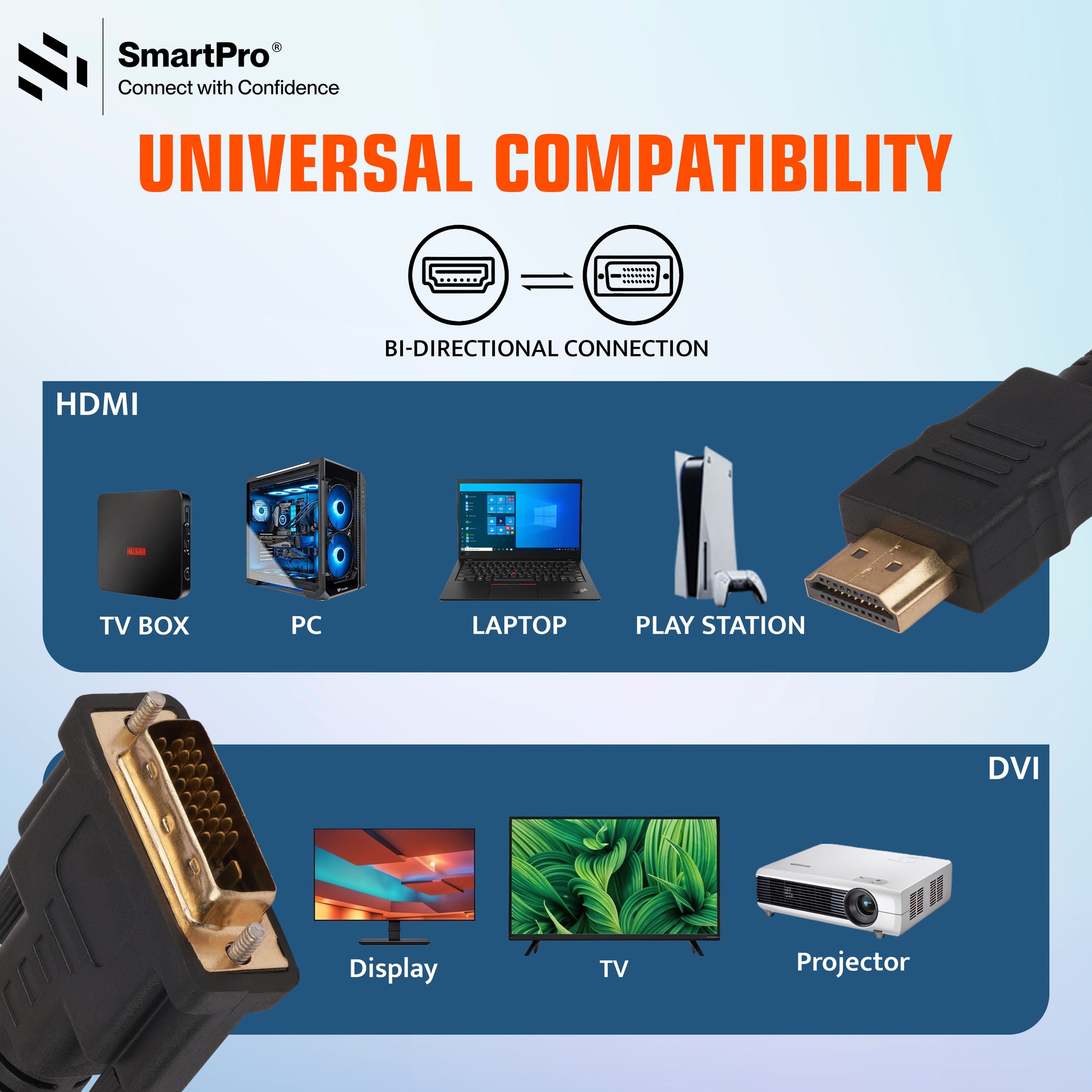 Experience seamless, high-quality digital video transmission with the SmartPro HDMI to DVI 24+1 Cable. Designed for performance and durability, this premium cable connects HDMI-enabled devices such as laptops, set-top boxes, Blu-ray players, and gaming consoles to DVI-equipped monitors, projectors, or graphics cards — ensuring crystal-clear video output every time.