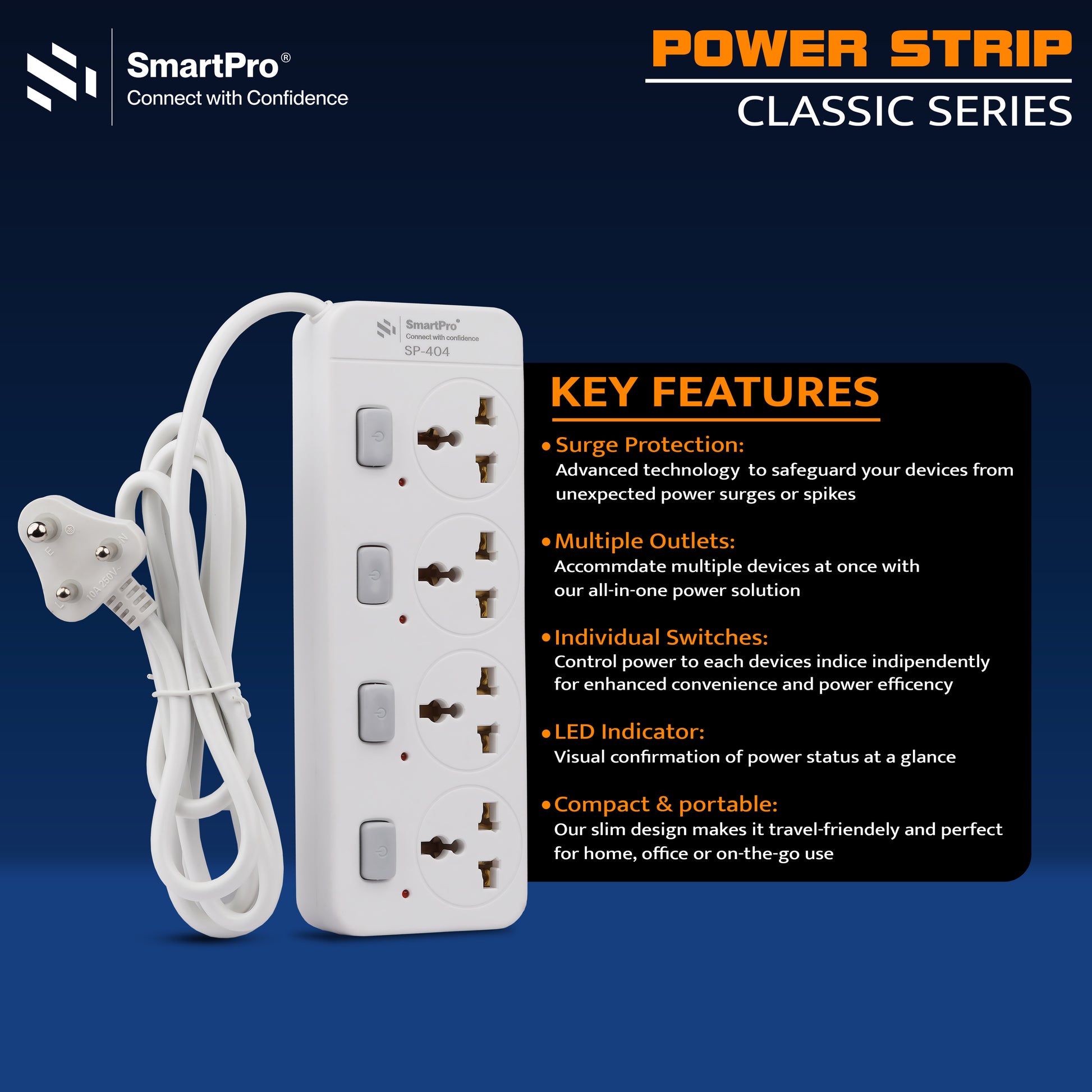 Upgrade your power management with the SmartPro Power Strip 4+4, designed to handle multiple devices with ease and ensure complete safety. Perfect for home, office, and commercial use, this power strip combines durability, convenience, and premium build quality.